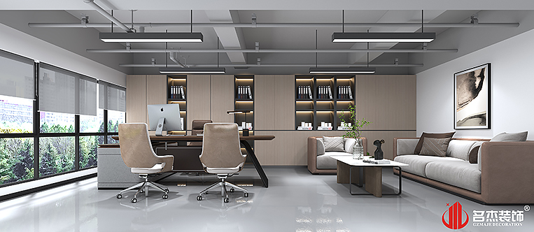 整体办公装修设计空间加入了造型柜子来增加空间的层次感,同时也为空间的储物做出一个不错的设计。加入不同的造型灯光,可以让空间中的氛围感更加有趣。空间也加入了该企业的材料来让企业文化更加浓郁。
