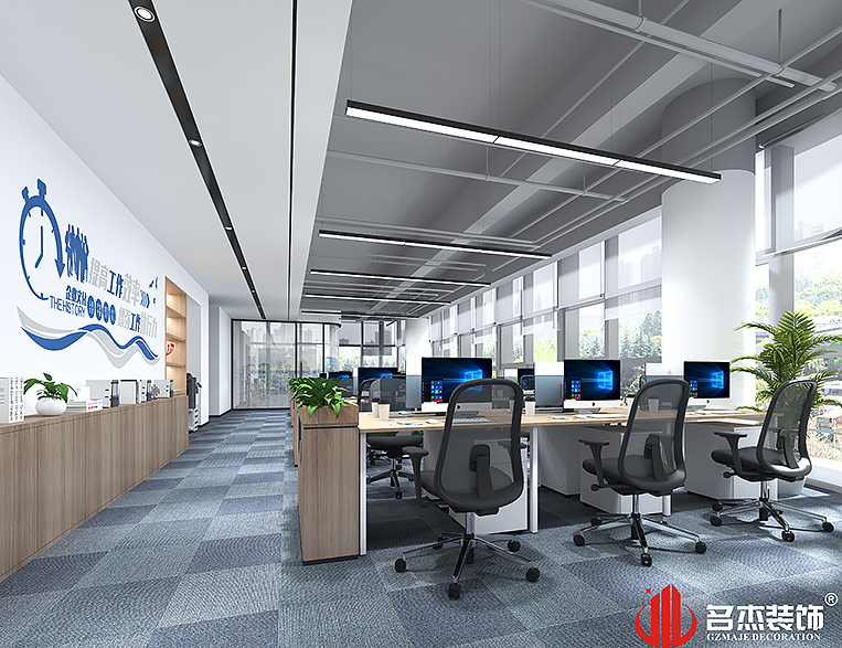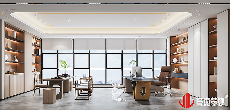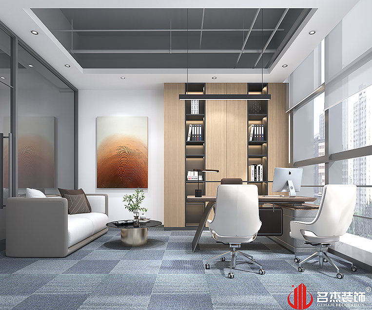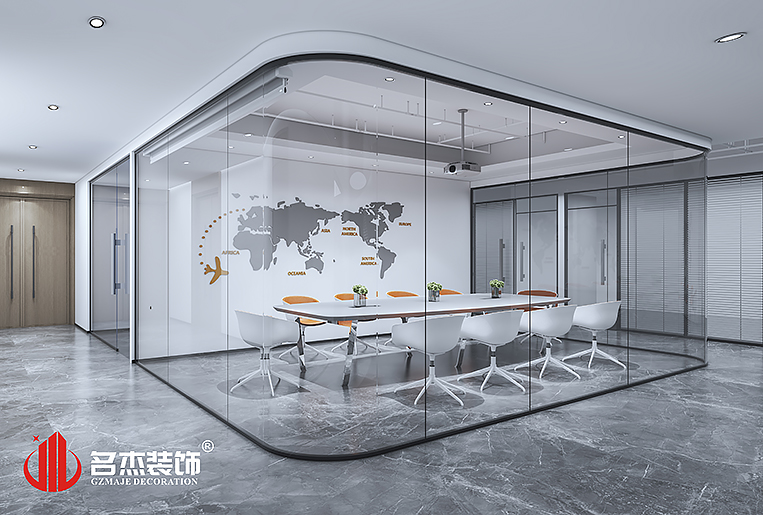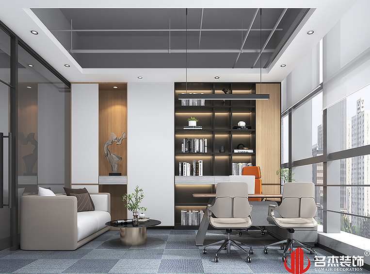 整个空间加入使用传统的黑白灰作为主色调,同时加入暖色橙色作为点缀,让空间的层次感更加突出。前台区域在天花吊顶方面使用水波纹不锈钢作为整个空间的点睛之笔,重点突出行业特点的同时也为整个办公装修设计空间增加更多的氛围感。