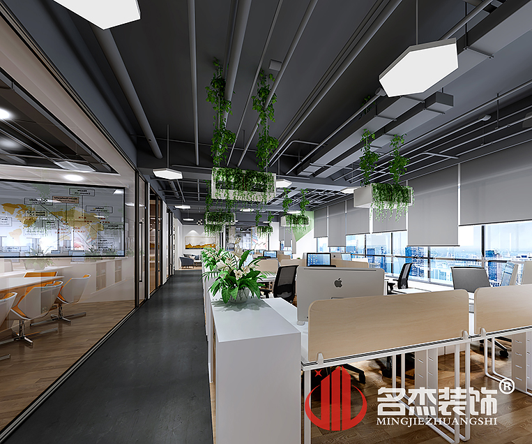整个空间都充满了绿色环保的氛围,很好的将企业文化和企业元素加入到整体的办公室装修中,让人时刻感受到该企业的文化。绿色元素的加入,再用橙色作为点缀色,使得整个空间显得更加的有时尚感。