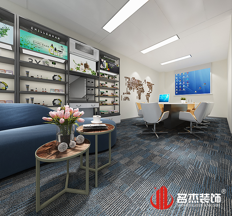 考虑到化妆品以女性为主,现代女性审美以小清新自然风居多。整体以薄荷绿和原木色相互交替,视觉感清新优雅,更能留住女性的心。办公室区域装修又较为不同,明显分别出各个区域,员工的舒适就是工作动力业绩上升的踏板。