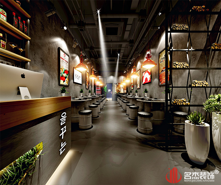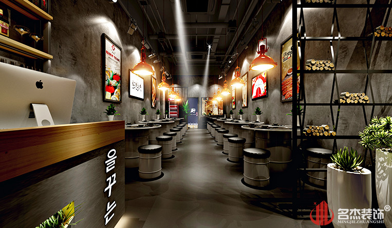 打破餐桌不锈钢生硬的格局,以达到整体空间好的融合度。中华民族乃礼仪之邦,在设计上把收银台布置在进门口左侧方,以方便顾客买单?;箍筛玫姆奖阌庸丝?,达到功能价值最大化。收银台造型如卡车车厢,造型新颖,简洁大方,让人耳目一新,给客人留下深刻印象。而在颜色上更加能让人眼前一亮,引人注意,给人以兴奋和热情的红色。也象征寓意着老板生意兴隆,红红火火。再加上艺术吊灯,收银和迎宾区有着浓浓的艺术气氛和文人气息,给美食增添几分有意的情调。灯光在空间的营造上,亮度适中,暖色灯光,吊灯和射灯的灯光营造出一种宁静和雅致的空间,给客人一种享受美食和享受静好时光的自然和诗意空间。