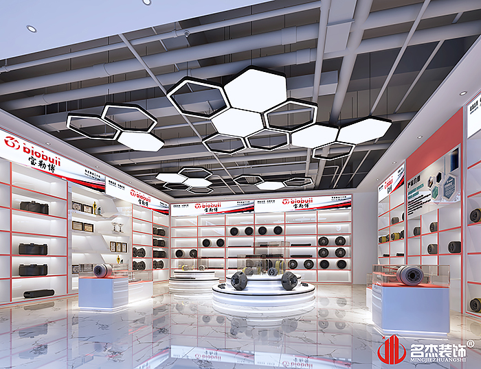 前台区域加入了很多的弧形元素,为整体的设计感大大提升了好几个档次,同时也在部分的柱子上加入企业LOGO色来作为点缀。展厅天花部分则采用蜂巢状的灯具,表达出一种像蜂群一样的勤劳工作的寓意。