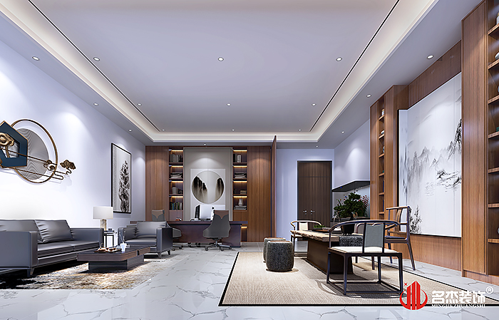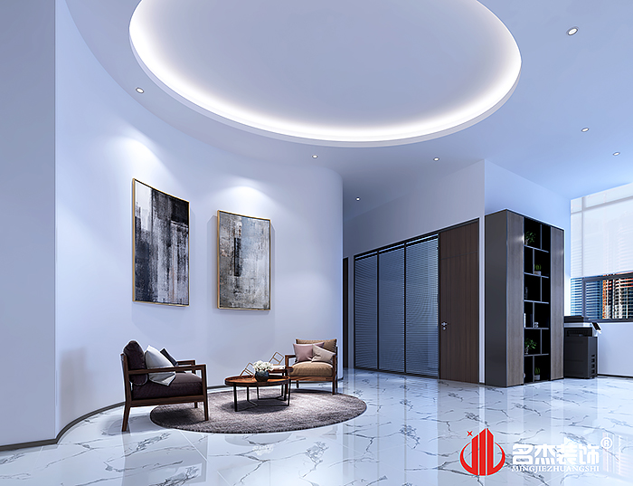 本案例是以汽车部件为主的企业,设计师通过前期的沟通和了解,通过将企业的logo颜色加入到整体的设计当中,把企业文化和品牌意识融入到整体办公室装修设计空间当中。也根据客户的要求,在前台位置设计了一个关二哥的立像作为元素,使得整体空间设计有别于外面千篇一律的设计