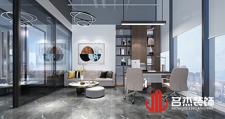 前台使用的是大理石纹背景墙,来突出整体的大气稳重感,而办公区域则使用简约的工业风,加以大面积的蓝色色块来作为点缀,增加整体的设计感。茶室使用的是不规则的装饰品和稳重的中式风格的桌椅来增加空间中的稳重感。
