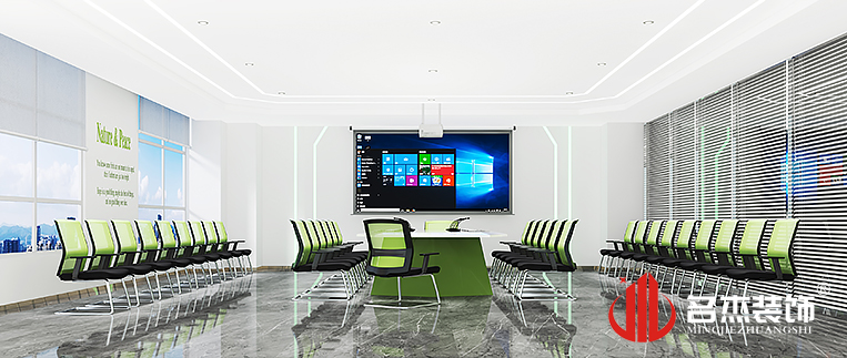 整体办公室装修设计中以绿色作为主打颜色,加入到各个区域当中,来凸显整个企业的发展思路。在展厅区域中加入不同的造型来凸显出整体的时尚感,也更加突出空间的设计感。现代简约风格很好的表达出企业的愿景,以及对未来发展的规划,从而引导企业走向更好的未来。