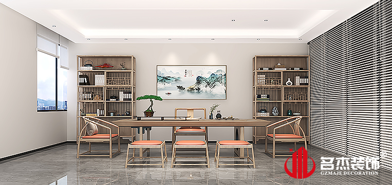 在前台装修设计方面,利用对称的方式加上装饰感强烈的球型灯具,来增强空间的设计感。开放式的展厅设计,加入一些有设计感的灯带,更加能够突出展厅的时尚科技感。而在茶室装修设计方面,则是利用传统的风格来显示企业稳重的方面。