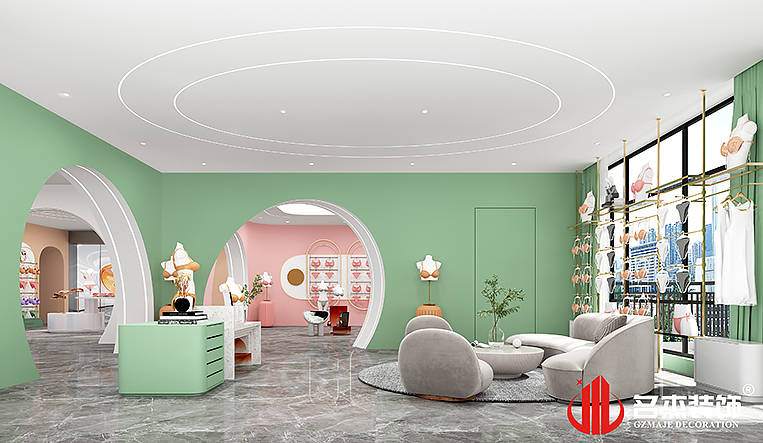 在前台区域使用线条和弧形元素来增加空间的设计层次感,同时在整体设计当中加入了莫兰迪色系作为点缀元素,让空间的设计层次感再次得到提升。不同子品牌采用的是不同的颜色,这样容易让大众更好的识别,同时赋予子品牌不一样的活力,再加上不同于常规造型的门,突出想要做出别样的装修设计风格。