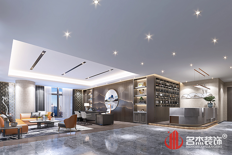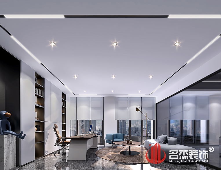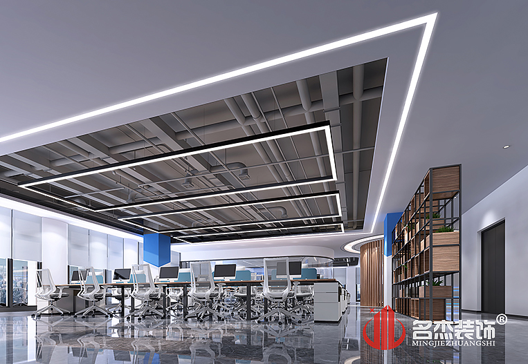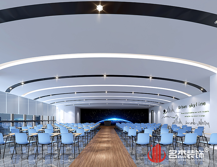 考虑到企业是为客户提供专业的咨询服务,整体设计运用了蓝色灯带来衬托出满满的科技感,以及圆弧形元素能够让整个办公室装修设计空间表现力更强。运用圆形穹顶使得整个培训室看起来更加的大气。