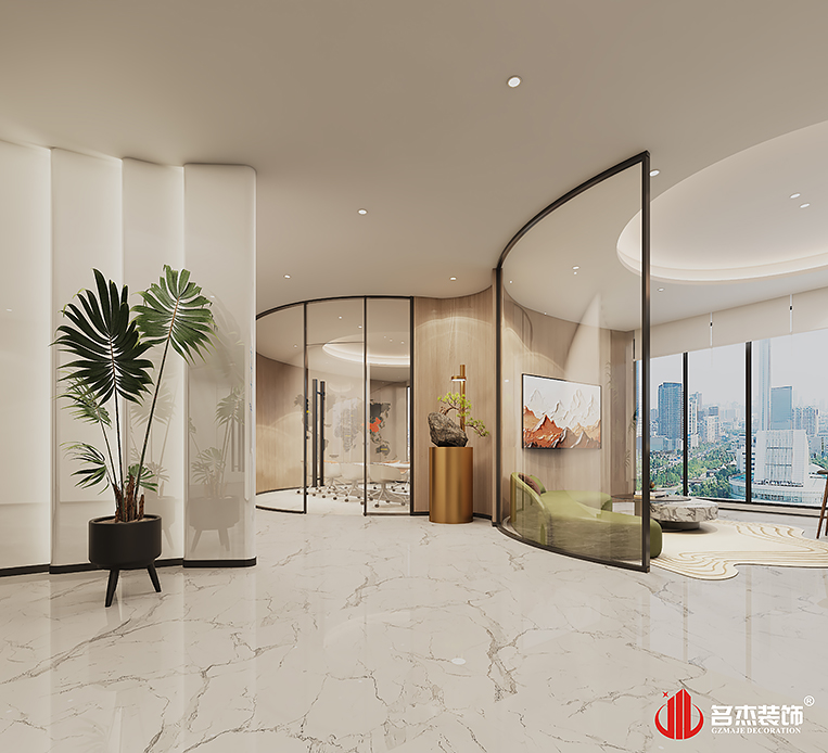 整体办公室装修设计空间是采用时尚简约风格作为主题风格的,但设计团队根据该企业的科技行业属性,加入曲线这个设计元素来作为点缀,搭配米白色系,空间的设计层次感就非常明显了。适当加入弧线灯带也是能够让单调的天花吊顶有了不一样的设计表达方式,增加整体办公室装修设计空间的设计感。#广州办公室装修设计公司#