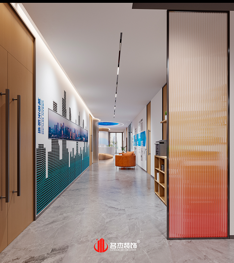 时尚简约是这次设计的主导风格,但设计师并没有遵循往常的时尚简约设计手法,而是大胆结合空间特色,使用金色的作为空间的点缀色,同时,结合碳晶板以及冲孔铝单板,微空间带来了更好的视觉搭配。带有引导线的动线规划将各个功能区域功能全部发挥出来。空间中时不时出现的撞色设计,也为该空间带来更多的视觉冲击感。#广州办公室装修设计公司#