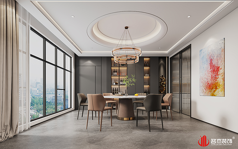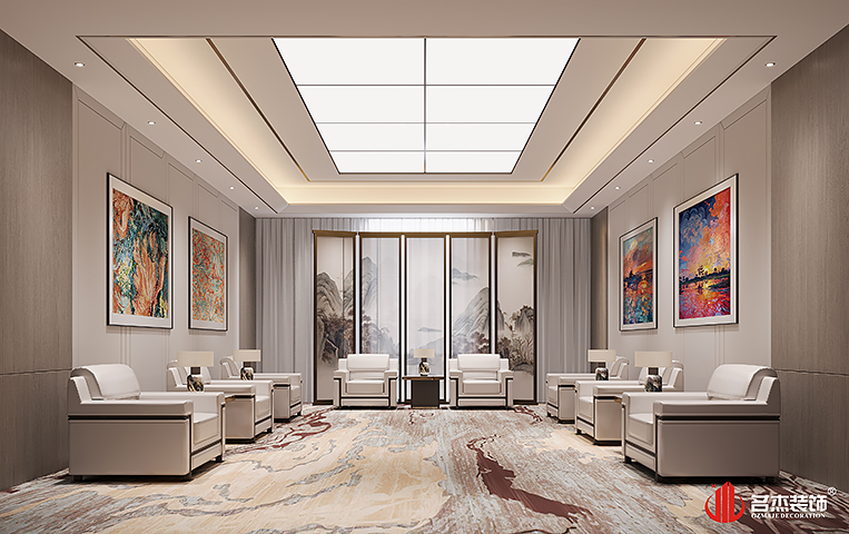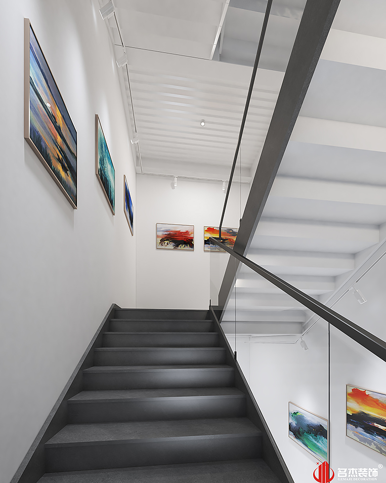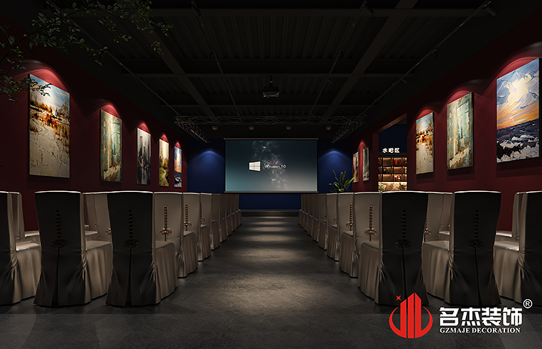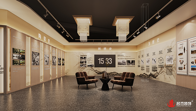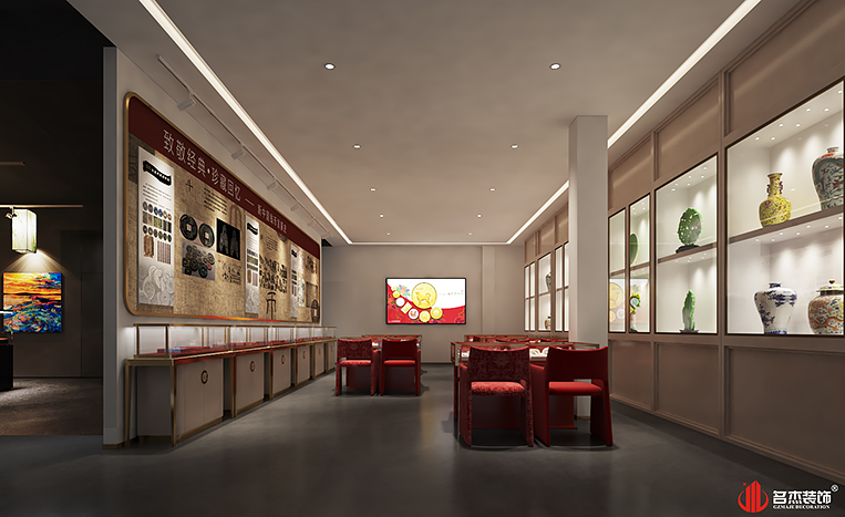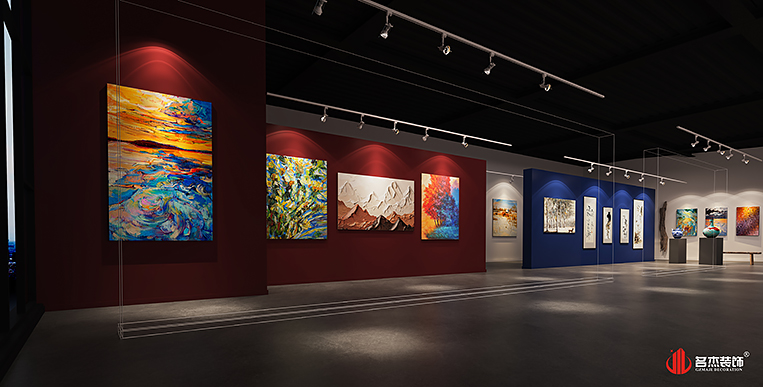 设计团队在前台区域使用圆形吊顶,辅以具有线条美的灯具,配合中式传统的配色来打造这个前台区域,让这个区域看起来带有浓浓的新中式风格。在展厅区域,则是使用仿灯笼造型的灯具,配合展厅的展品,来让这个空间散发出更加浓郁的传统氛围。而在另一个展厅则是使用红色和蓝色,在视觉上形成一种强烈的冲击感,让空间看起来更加具有特色。#艺术馆装修设计#