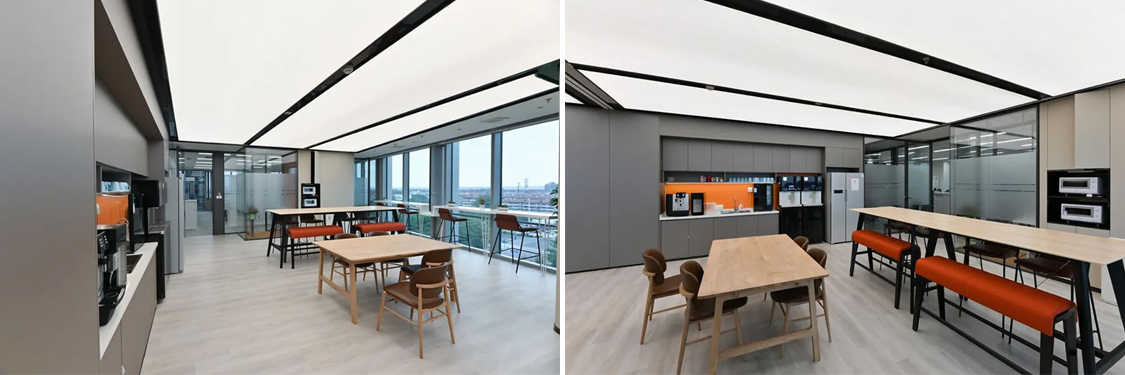 设计团队特意选择了一处大型开敞的临窗场地,在酷炫的3D裸眼展示室旁边也打造了衣蛾4S店的培训和茶水间二合一空间,来满足客户快速发展的团队培训和新品发布,员工活动的需求。临近建筑幕墙的位置,设计团队就设计了一派沿窗的休闲阶梯造型台阶。员工部分选用了可升降的办公桌,来满足员工办公的个性化需求,白灰色的家具搭配,混搭浅木色的休闲洽谈区域,地面则是选用环保地毯来提升空间品质和美感。